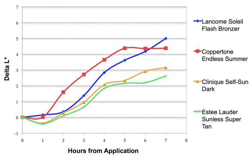 In the last few years, the desire to acquire a tan without sunbathing has grown. In response, many cosmetic companies have produced self-tanning preparations. However, to optimize these formulations, a suitable model to assess the colour induced on the skin remains to be developed. We have developed an in vitro method using a synthetic skin in order to study the efficacy of self-tanning formulations. The in vitro test was then used to study the influence of cosmetic ingredients upon the colour induced by erythrulose- or dihydroxyacetone-containing formulations. Finally, an in vivo study allowed us to relate the results obtained in vitro with those found on human skin. The results show that this in vitro test system is a reliable tool to predict the efficacy of self-tanning products.